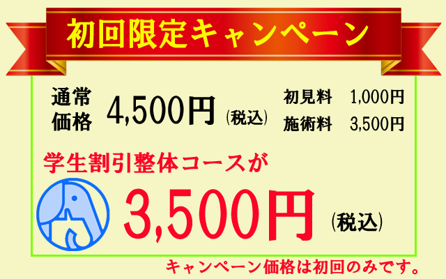 キャンペーン価格には初見料も含まれています。学割整体コースの場合、2回目は学割価格の3,500円です。